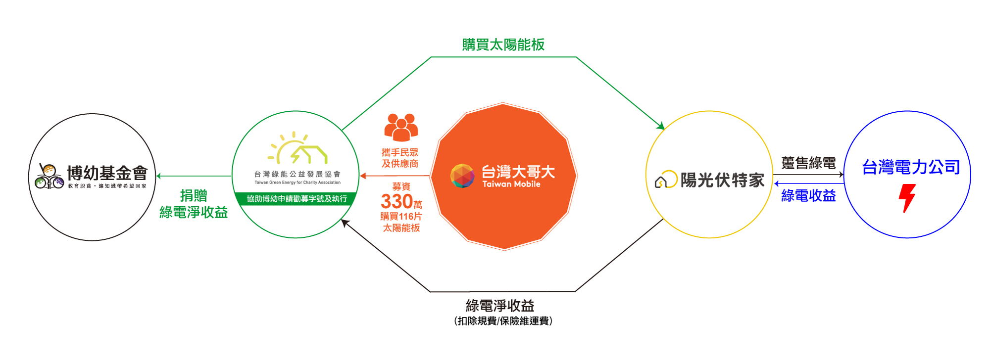 - 躉售台電之綠電收益,扣除規費/保險維運費後,由陽光伏特家將20年電費收入全數匯給「台灣綠能公益發展協會」。
